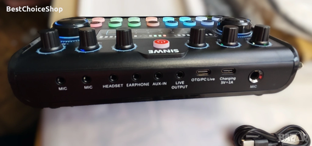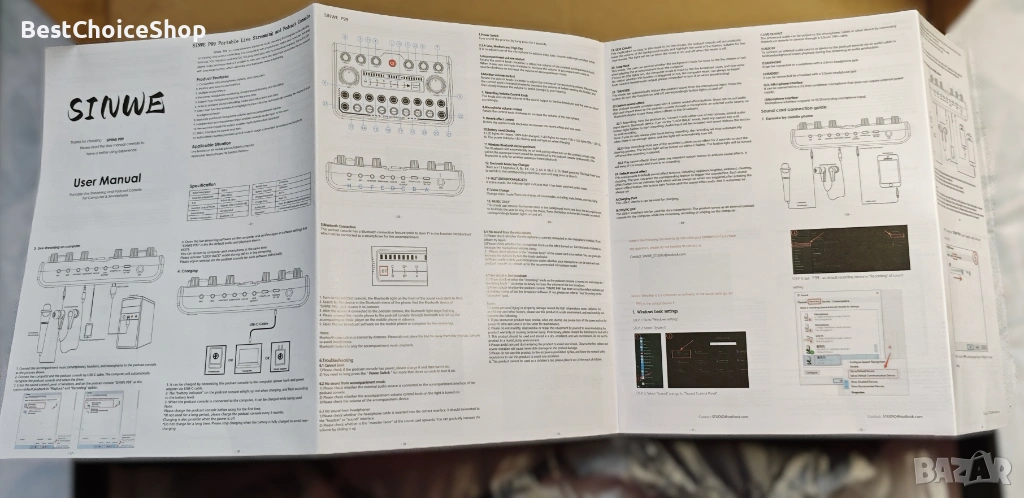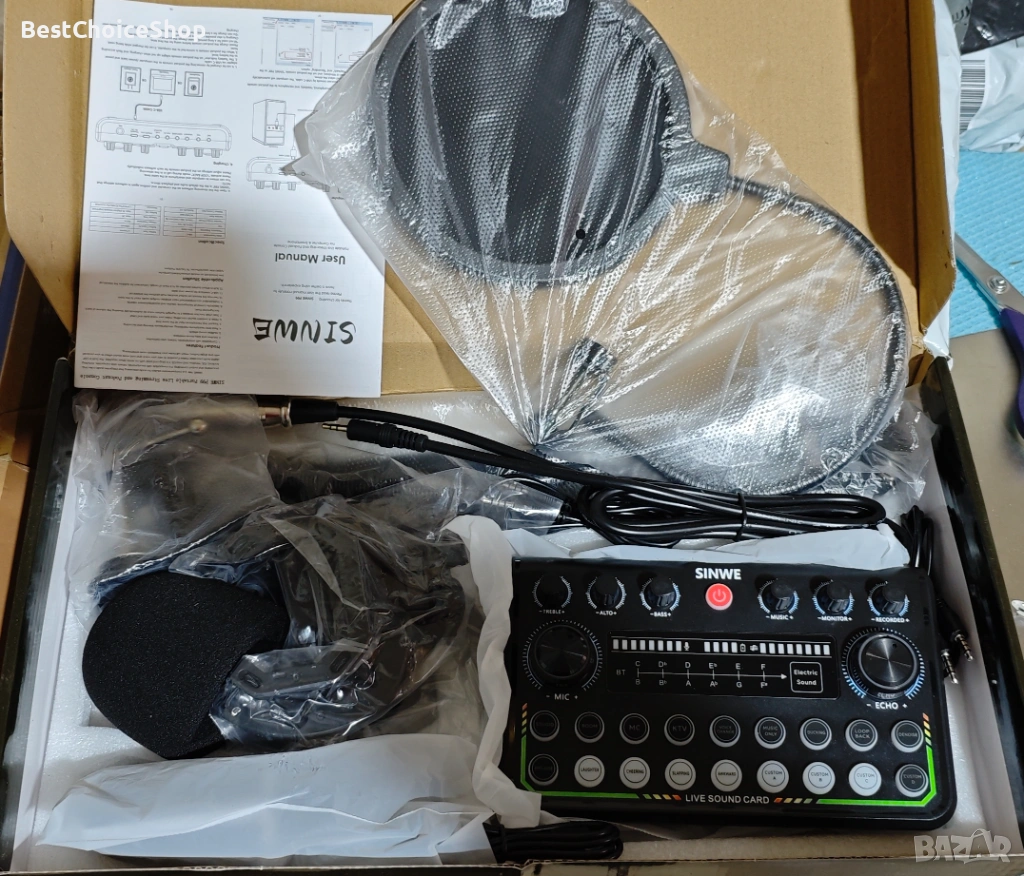комплект за подкаст Sinwe Pro, който включва студиен миксер (звукова карта) с кондензаторен микрофон.