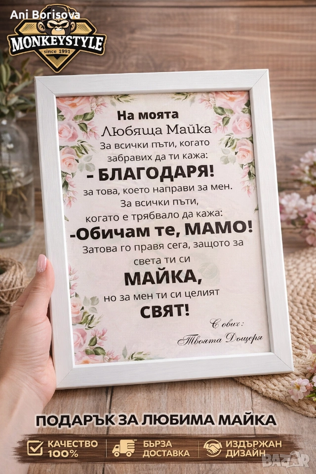 🌸 Емоционален и стилен подарък за 8 март и специални поводи 🌸 Предлагам подаръчни сертификати и картини с лично послание, подходящи за: 💐 8 март 🎂 Рожден ден ❤️ Благодарност и обич 🔸 Варианти: ✔️ Сертификат „Най-добрата майка / баба / леля“ ✔️ Картина с текст и/или снимка ✔️ Лукс и винтидж дизайни ✔️ Възможност за рамка ✨ Персонализация с име и послание ✨ Качествен печат ✨ Подходящи за рамкиране и подаряване 📩 Пиши ми за: – за кого е подаръкът – текст – избор на дизайн – срок за изработка 📦 Изпращам с куриер в цялата страна.Цени от 7€