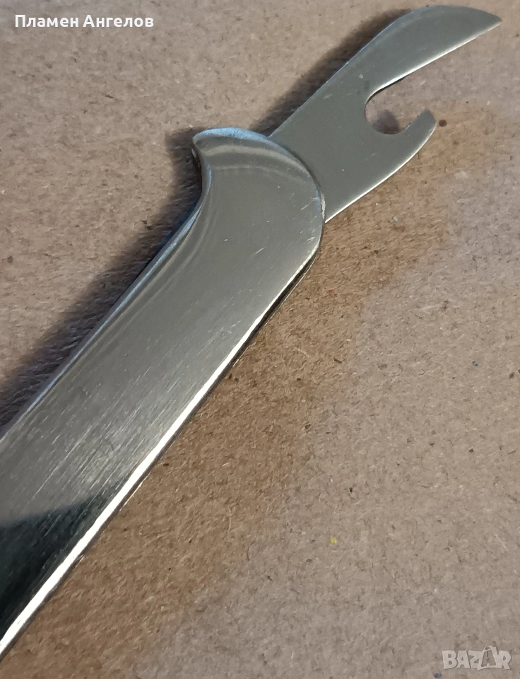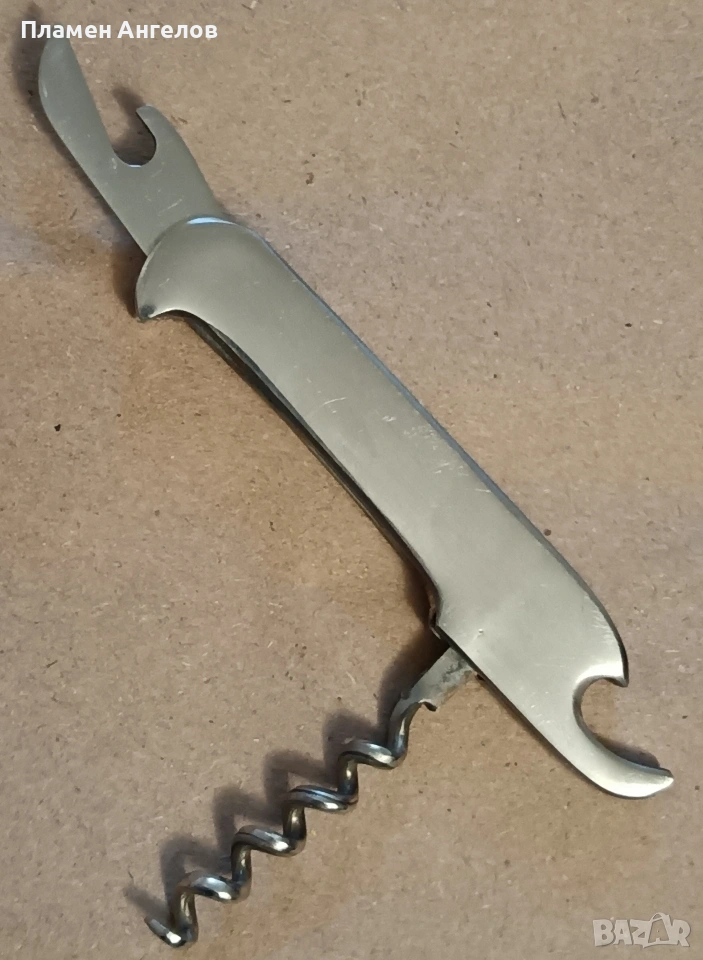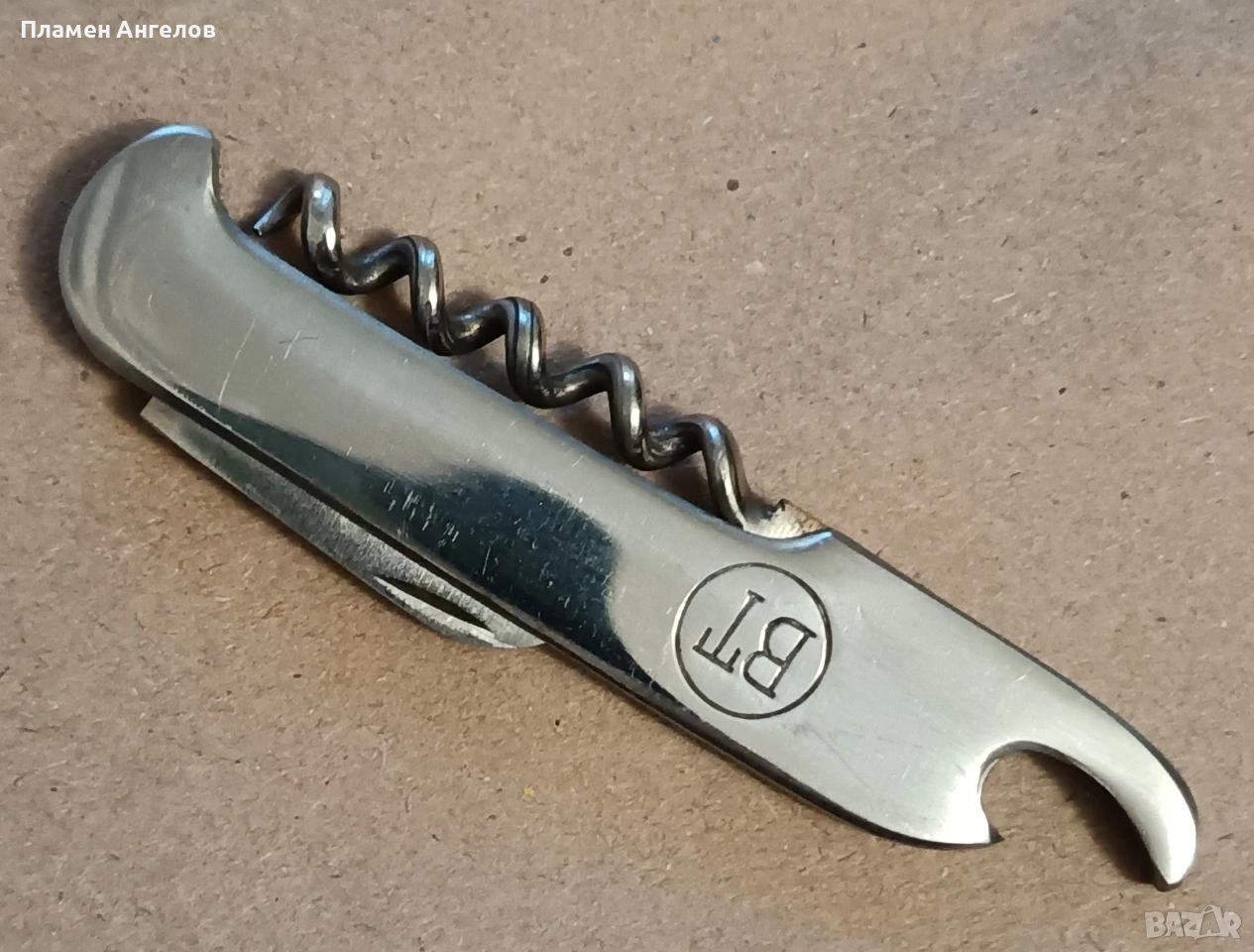 Стара българска метална отварачка с тирбушон, често наричана още "туристическо ножче" произведено от "ВТ" Велико Търново. Чисто ново, неизползвано, със заводската си полировка. Нова със запазен блясък, все едно сега излиза от завода. Стегнат механизъм. Няма луфтове, огледално полирана.