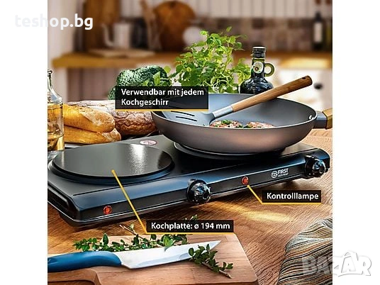 За преместване, къмпинг, пътувания, партита или в малки кухни здравата двойна плоча за готвене е незаменим помощник. Благодарение на компактния си размер, плотът е лесен за съхранение. Той осигурява бързо и равномерно разпределение на топлината чрез инфрачервена технология. Двете плочи имат диаметър 19,4 см и са подходящи за всички тигани и тенджери. Дискретният черен цвят придава на уреда елегантен вид. Плотът разполага с безстепенна регулация на температурата чрез термостат, две индикаторни лампи и защита от прегряване. Двете плочи за готвене осигуряват общо 2 500 вата мощност / 1 250 вата на плоча.