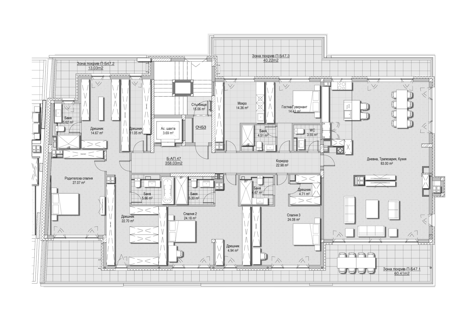 - Представителна дневна зона с трапезария и кухня 83 кв.м
