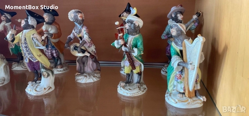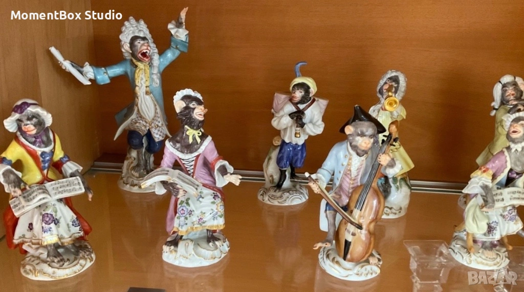 21 фигури от майсенски порцелан. 1-во качество. 1850-1880. Височина 14 см. Целият известен Маймунски оркестър - Monkey Orchestra - Monkey Band. + статив за ноти отново от майсенски порцелан.