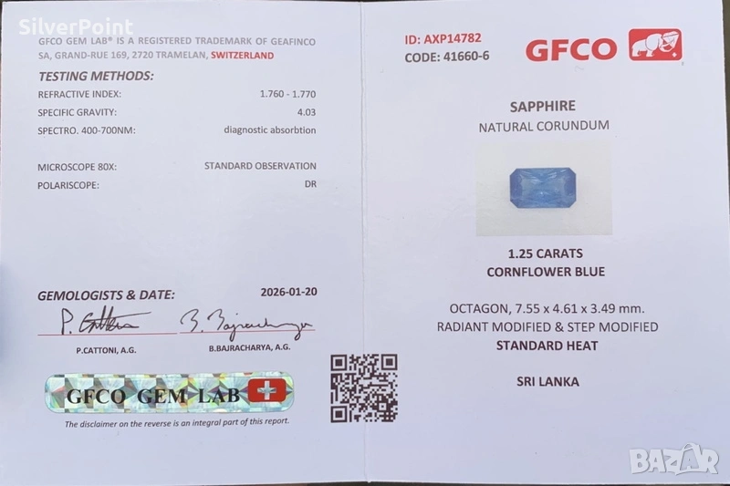 Сапфир cornflower blue с швейцарски сертификат → Обява 53626972