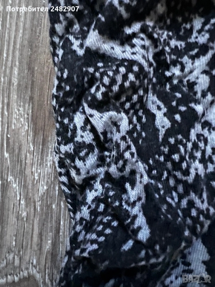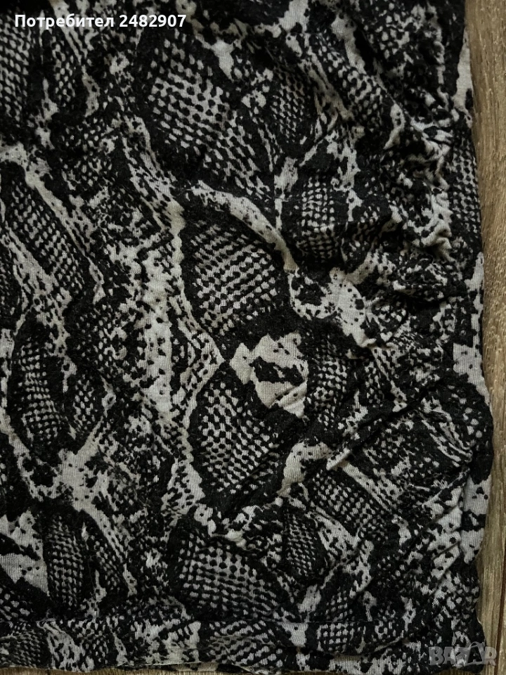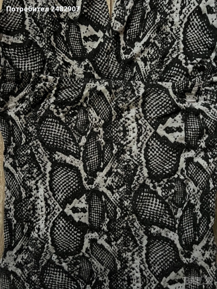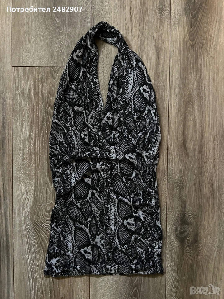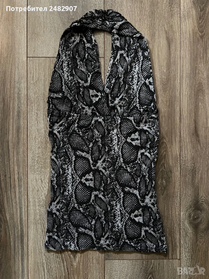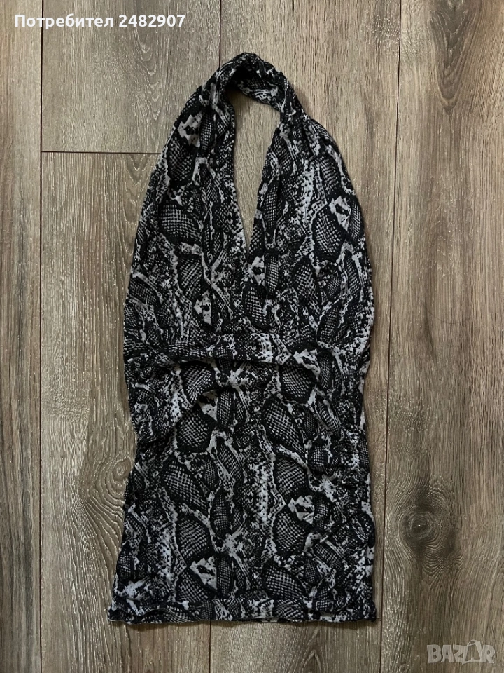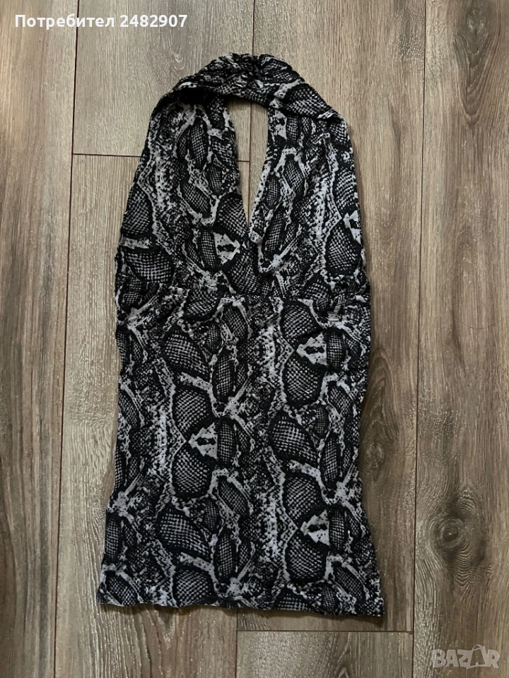 Дамски потник с гол гръб и змийски принт, размер ХS. Съдържа 96 % вискоза и 4 % еластан. Ширина под мишниците - 30 см, ширина в долната част - 32 см, дължина от горната част на презрамката до долу - 66 см. Много запазен, почти не е използван, без забележки.