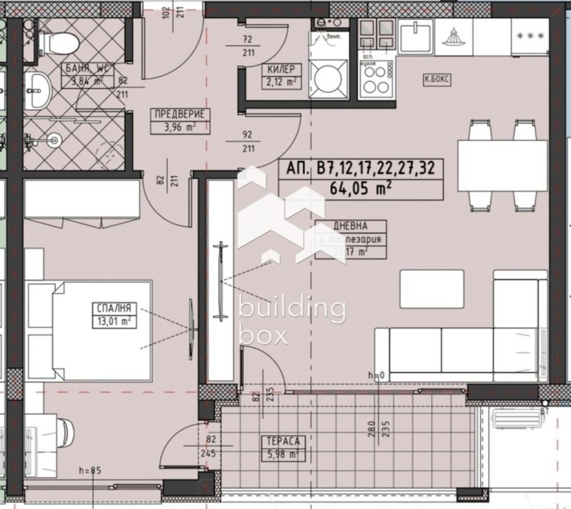 РАЗПРЕДЕЛЕНИЕ: Просторна всекидневна с кухненски бокс 27,17 кв. м, спалня 13 кв. м, баня с тоалетна 4 кв. м, килер и тераса.