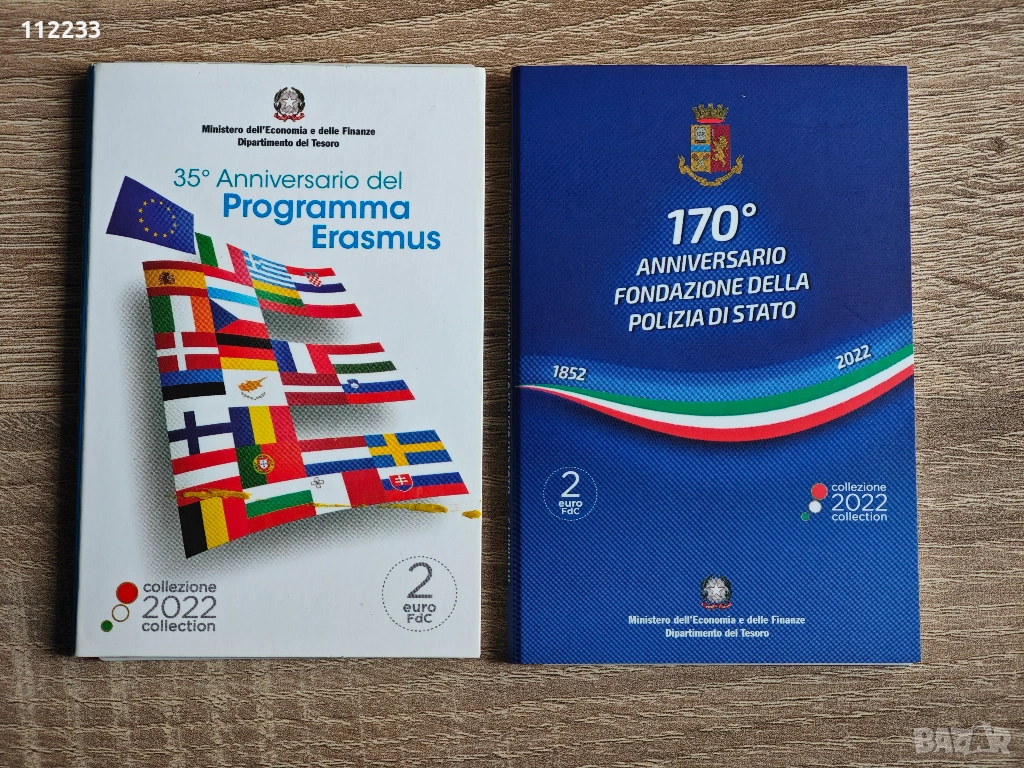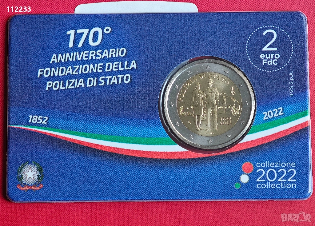 2022 Италия Национална полиция- Възпоменателната италианска монета от 2 евро е посветена на 170-годишнината от създаването на италианската национална полиция. Монетата е с номинална стойност (BU) в карта.