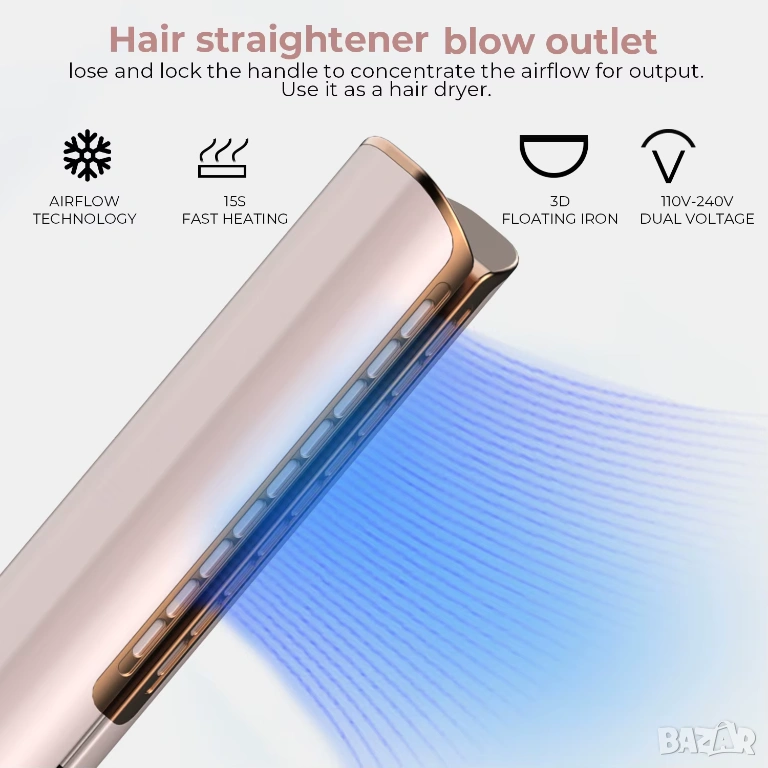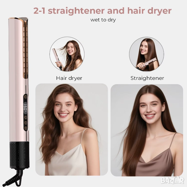 Постигнете салонни резултати у дома с иновативната преса-сешоар 2 в 1 – модерно устройство, вдъхновено от технологиите на Dyson, което съчетава бързо изсушаване, прецизно изправяне и максимална грижа за косата.