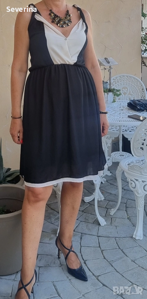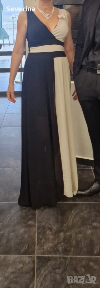 Роклите са ползвани за броени часове на повод. И двете са в еднаква гама-черно със слонова кост-цвят. Отговарят на Л размер, но биха станали и на М. Първата,дългата рокля е 35 евро. Втората, по-късата е 30 евро. Двете заедно-60 евро. Купувани са за доста повече, но няма да ги облека втори път,нека зарадват някоя дама!