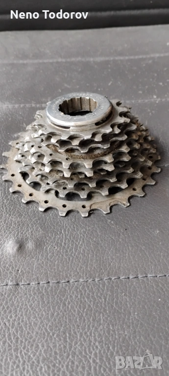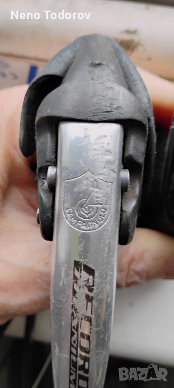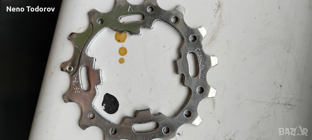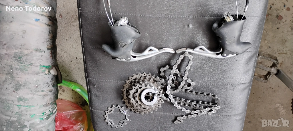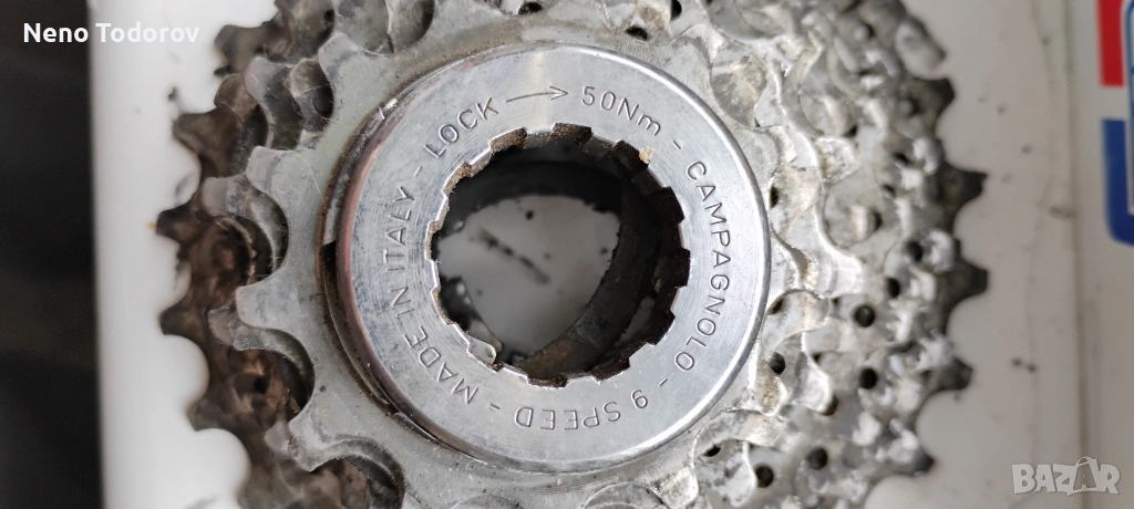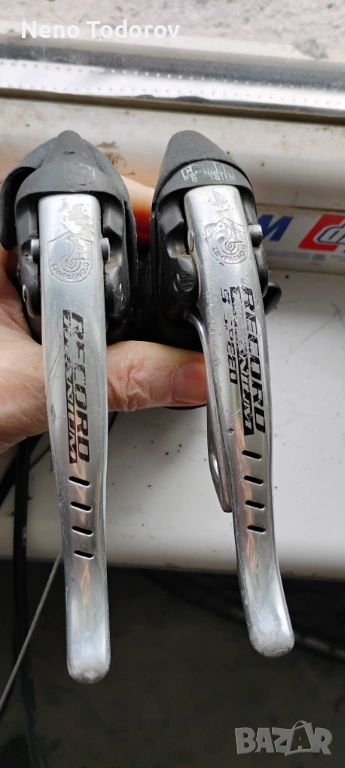 Koмплект задни венци, верига и дуал контрол campagnolo RECORD. Зъбчатката е campagnolo, 9 скорости, на шлици, от 13 до 25 зъба, плюс подарък резервен венец 15 зъба. Комплекта включва верига shimano и дуалkонтрол campapagnolo RECORD 9 скорости.Eдна от гумите е с лека забележка. При интерес разполагам и със задния дерайльор 9 скорости campagnolo MIRAGE