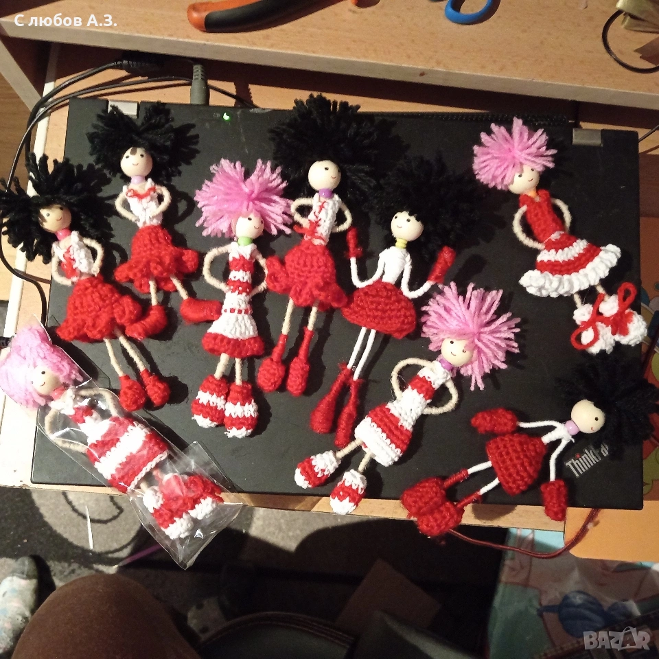 Най-продаваните ми мартенички - сладки кукли, плетени на една кука с тел, могат да се движат. Нямам налични, плета при поръчка. При единични бройки изпращам на следващия работен ден при по-големи количества до до три дни.