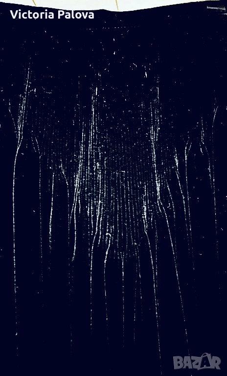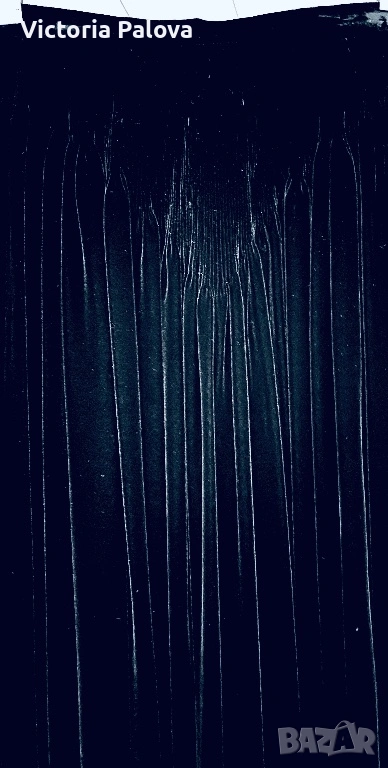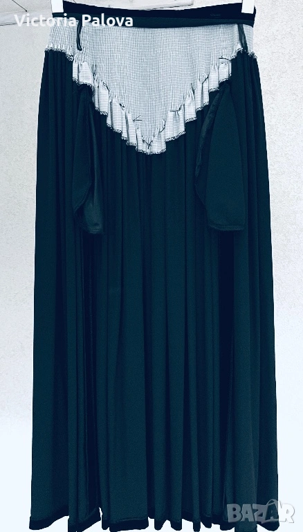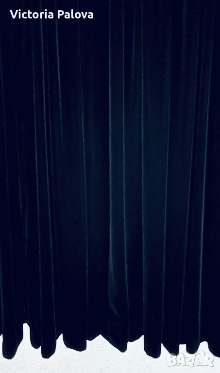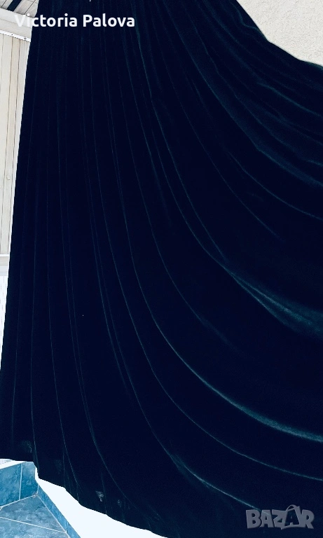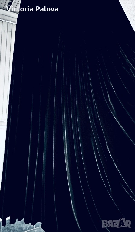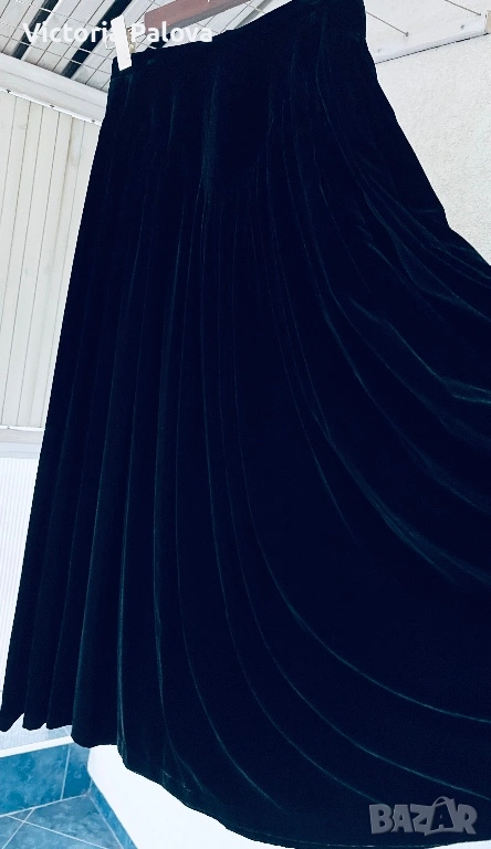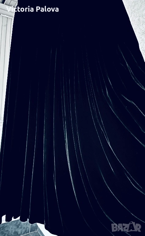 Черна пола от плътно висококачествено кадифе с дълбок, наситен цвят и естествен, мек отблясък при движение. Материята е тежка и стабилна, характерна за добре тъкано кадифе. Платът пада свободно и оформя чист, обемен силует, без разширяване в областта на талията. Моделът е богато разкроен, изработен с голямо количество плат, което придава плавност и равномерно движение по цялата дължина, с балансирана пропорция, подходяща както за по-официална среда, така и за стилна градска визия. Вътрешната конструкция в талията е изпълнена със стабилизиращ панел от светла тъкан, който поема тежестта на кадифето и осигурява равномерно, прецизно присборване. Благодарение на този детайл формата е ясно структурирана, без натрупване на обем в горната част. Изработката отвътре показва внимание към детайла и техника, характерна за марка висок клас ( няма етикет). Шевовете са прави и стабилни, а нишката на кадифето е правилно ориентирана, което допринася за равномерния визуален ефект. Размер 36 (S). Състояние отлично, без забележки. Модел с характерна конструкция и високо ниво на изработка, който позволява съчетаване както със структурирано сако и риза, така и с по-мека плетена горна част. Талия - 33см, дължина - 90см.