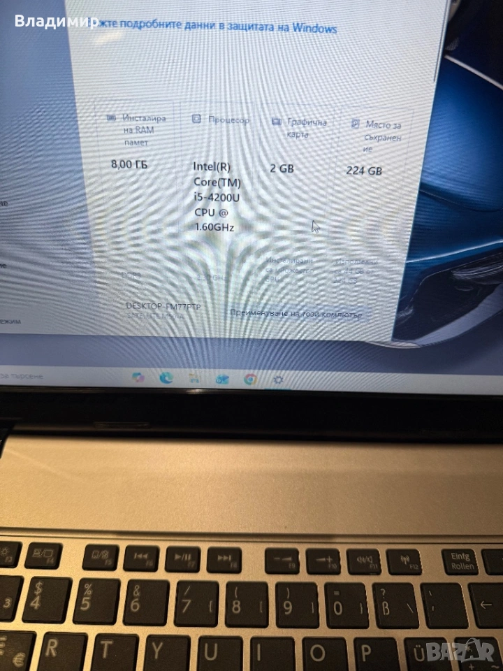 Лаптопа работи безпроблем,почистен и преинсталиран с нова термопаста,батерията държи над 1 час,има си и зарядно,има забележки по горния капак