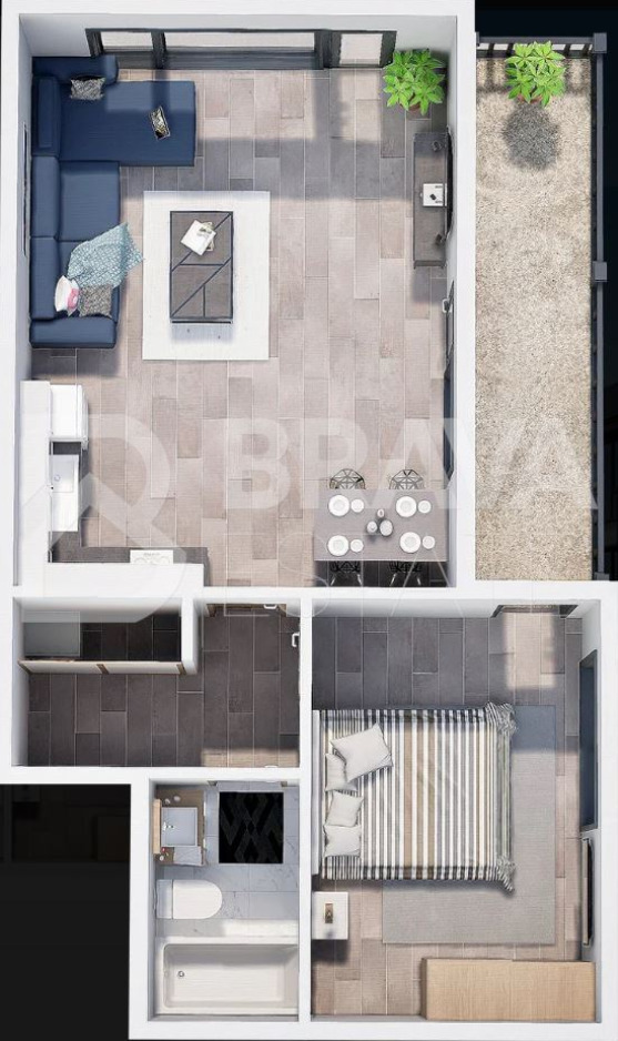 ➡️ Разпределение: Просторна дневна с трапезария и кухненски бокс, спалня, баня с тоалетна, входно антре и тераса