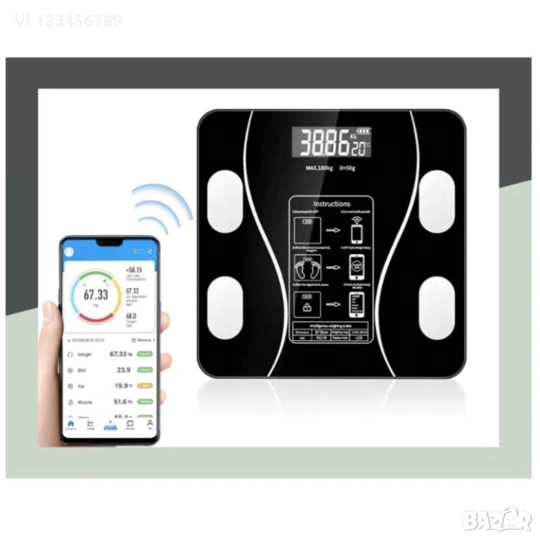Интелигентен кантар за тяло, смарт приложение,19 параметъра; до 180 Kg