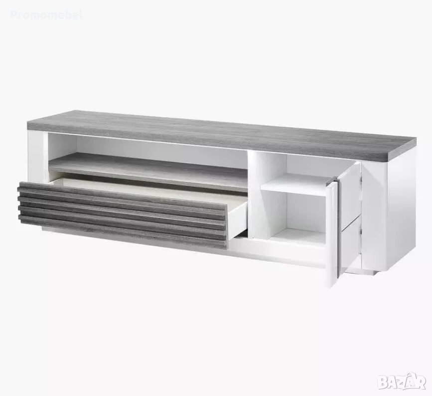 💫ТВ шкаф VERTIGO 🖥️ е елегантно и практично решение за модерния хол, отличаващо се с комбинация от сив дъб и бяло. Той осигурява функционално пространство за съхранение на Вашите уреди, книги и други предмети.