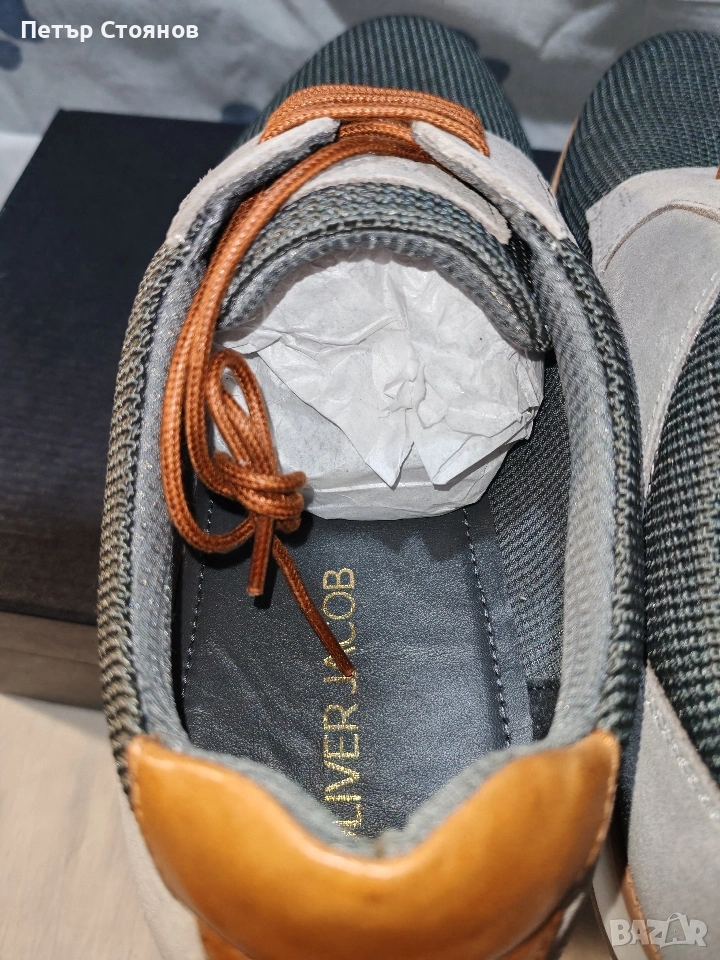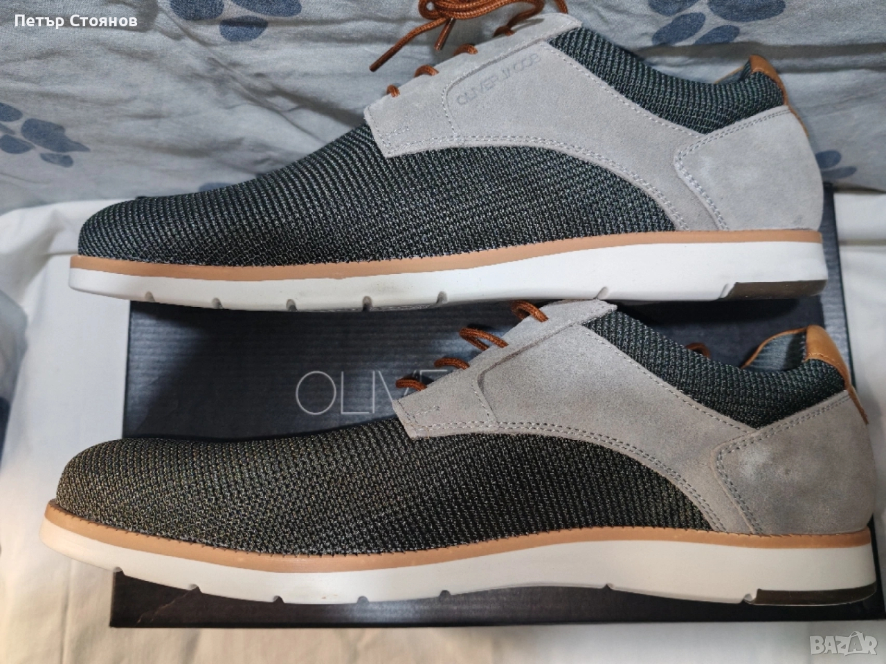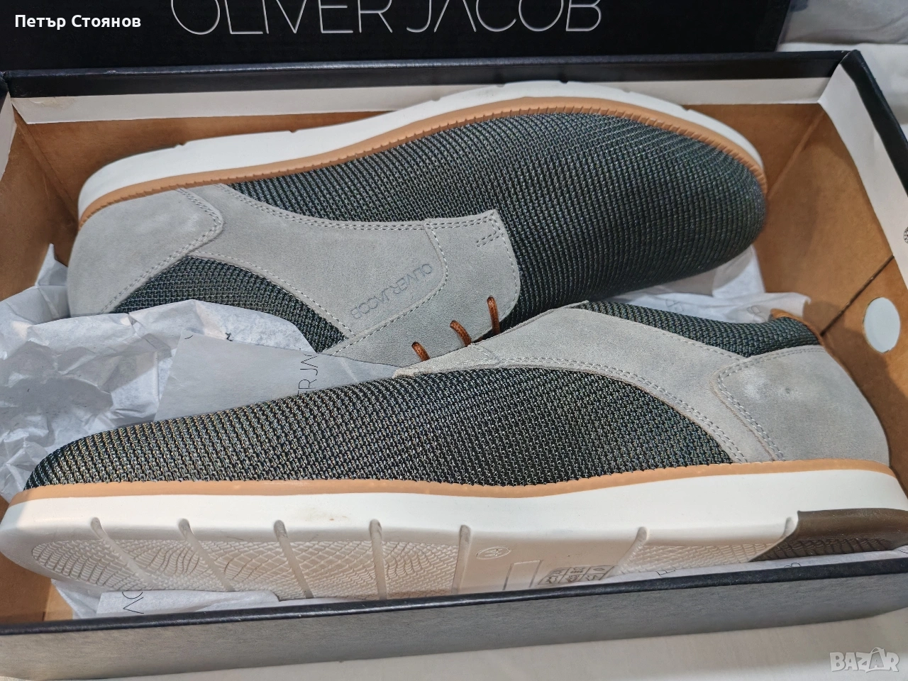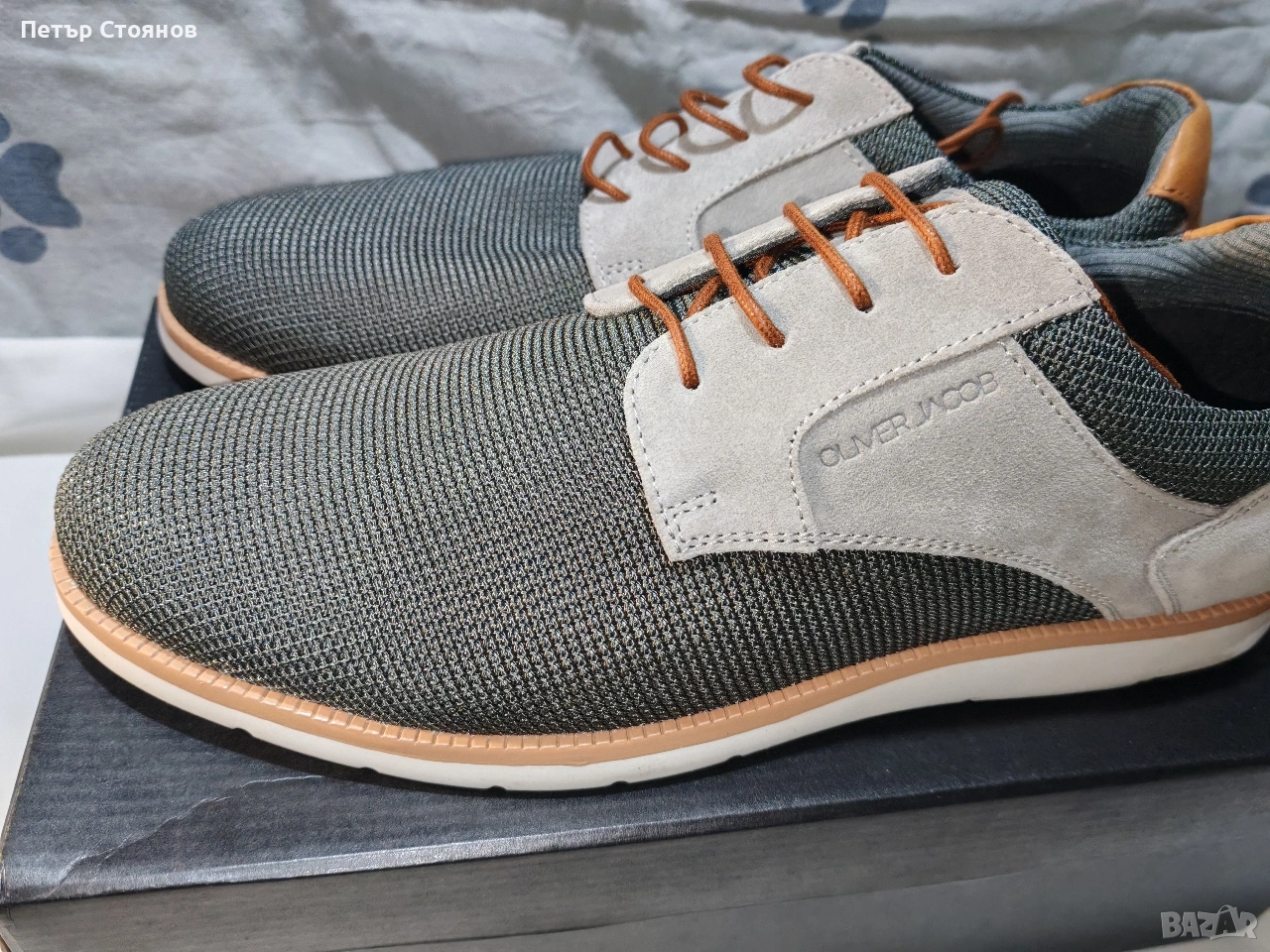 Предлагам чудесни мъжки спортно-елегантни обувки на марката Oliver Jackob. Обувките са купени на промоционална цена, защото са били мостра в магазин в Словакия. Изработени са от маслено зелен текстил в комбинация със светло сив естествен велур. Хастарът и стелката са кобинация от естествена кожа и текстил, подметката е от полиуретан, шити и лепени. Дължината на стелката е 28.5 см, височината на тока е 2.5 см. Изпращам с избран от купувача куриер и възможност за преглед и тест.