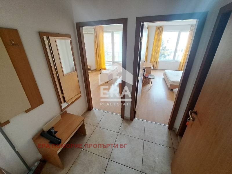 ЕРА Поморие предлага за продажба просторен двустаен апартамент в семеен комплекс на втора линия море в курорта Слънчев бряг. Апартамента е частично обзаведен и оборудван с необходимата техника. Състои се от голям хол с кухня и трапезария, спалня с изход на балкон и с изглед към озеленена площ. Изложението е югозапад. Ползването на басейна и шезлонгите е безплатно. Има детска площадка, закрит фитнес и охраняем паркинг (безплатен). Таксата поддръжка е 12,60 Евро на квадратен метър годишно. Разстоянието от комплекса до пясъчния плаж е 150 м. В близост е крайбрежната алея, атракции, ресторанти, кафенета, клубове, барове, супермаркети.