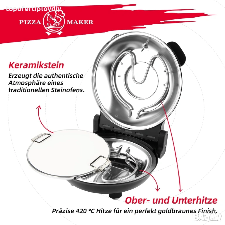 Професионален нагревател 420°C, готов за 5 минути: Оборудванa с мощна двойна нагревателна система от 1200 W, която достига до 420°C, далеч надвишавайки лимита от 260°C на конвенционалните фурни за пица. НЕ Е НЕОБХОДИМО ДЪЛГО ЧАКАНЕ - Насладете се на автентична италианска пица с хрупкава коричка и перфектно разтопено сирене само за 5 минути, която без усилие имитира съвършенството на каменна фурна.