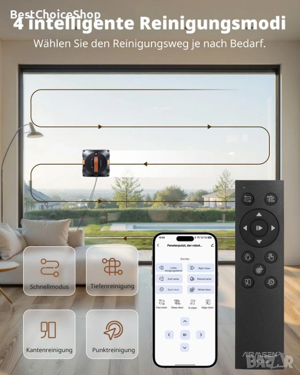 AIRMSEN YW733 Робот за почистване на прозорци, Автоматично планиране на маршрут, 4 режима на почистване, 4 дюзи за пръскане, резервоар 110 мл, всмукателна мощност 6000 Pa, противоплъзгаща система, за прозорци, стъкло за душ и огледало