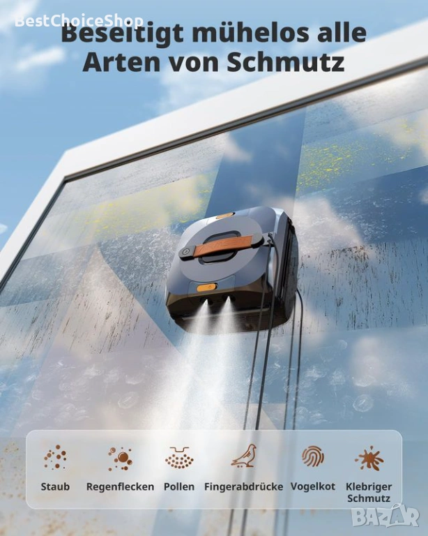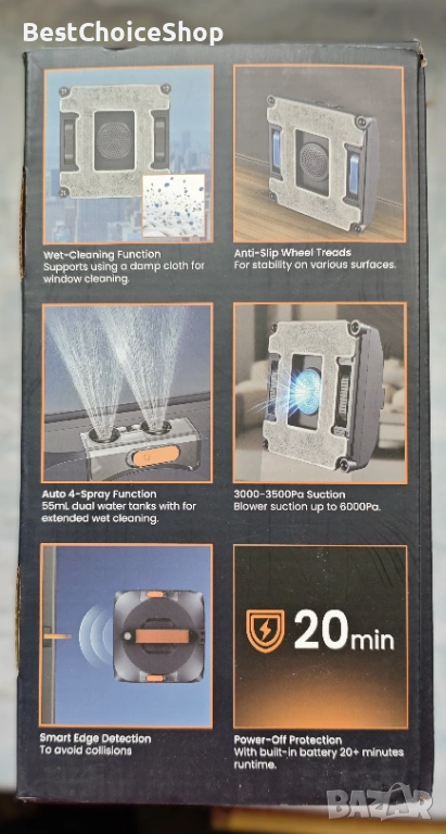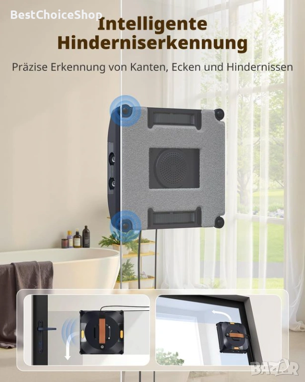 роботът е подходящ не само за прозорци, но и за стъкла на душ кабини, огледала, фуги на плочки и гладки повърхности. Минимален размер на прозореца: 50 × 30 см.