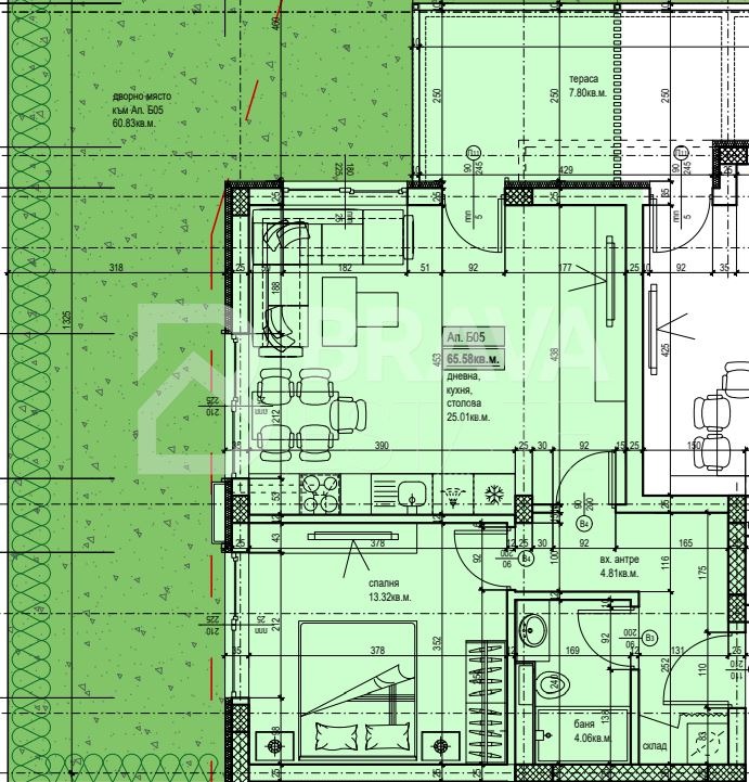 ➡️ Разпределение: Входно антре,просторна дневна с трапезария и кухненски бокс,спалня, баня с тоалетна, склад , веранда и собствен двор- 60.83 кв.м..