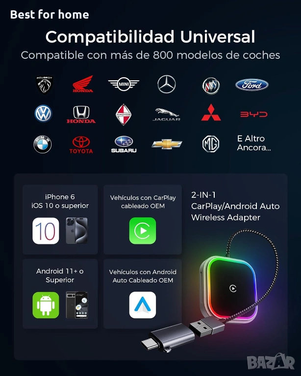 【Широка съвместимост】Безжичният CarPlay адаптер работи с iPhone 6 и по-нови модели с iOS 10 или по-нова версия и е съвместим с над 800 модела автомобили, оборудвани с фабрично инсталирана кабелна CarPlay функционалност (2016 г. и по-нови). Той запазва всички оригинални контроли (бутони, сензорен екран, глас, волан и копчета) за плавно и безопасно шофиране.