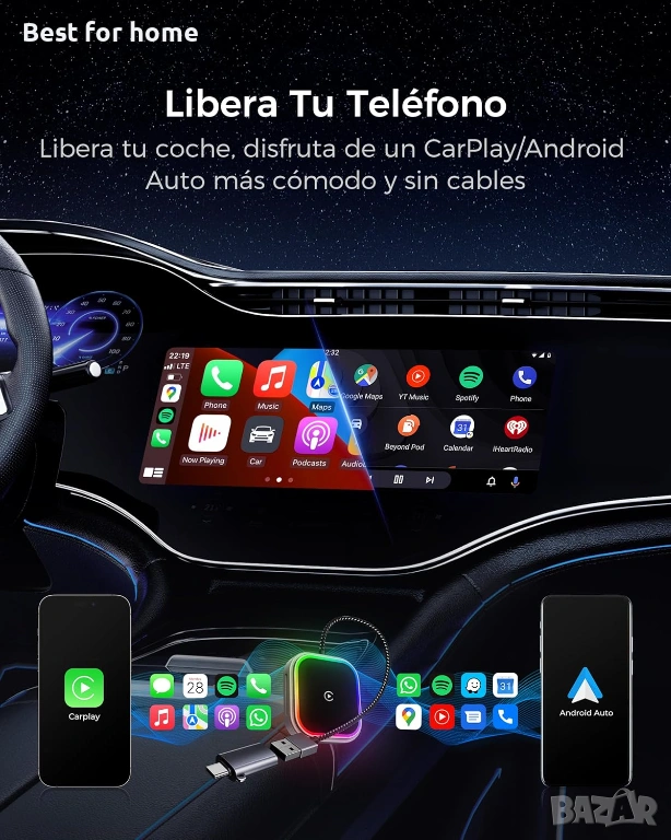 【Освободете телефона си, освободете шофирането си】Синхронизирайте лесно смартфона си с големия екран на колата си, като използвате безжичния CarPlay адаптер. Получавайте незабавен достъп до навигация, обаждания, музика, съобщения и други, без ръце. Наслаждавайте се на безопасно шофиране без разсейване с удобни гласови команди, докато се забавлявате и сте информирани с всичките си любими приложения.