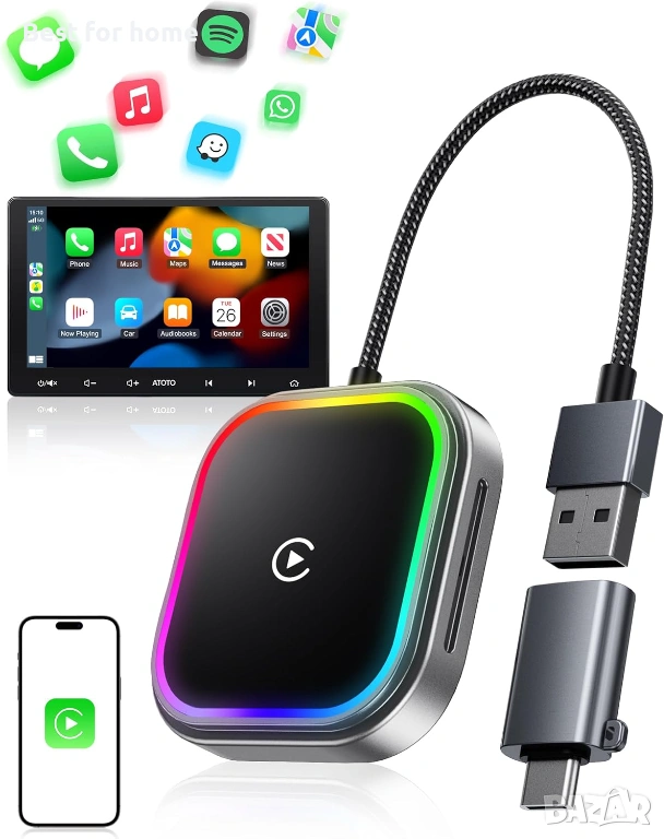 Безжичен CarPlay и Android Auto адаптер, Bluetooth V5.3 стабилна връзка, 5.8GHz бърз WiFi, с RGB амбиентно осветление, USB A/C за Apple iPhone iOS 10+, Android смартфон 11+.