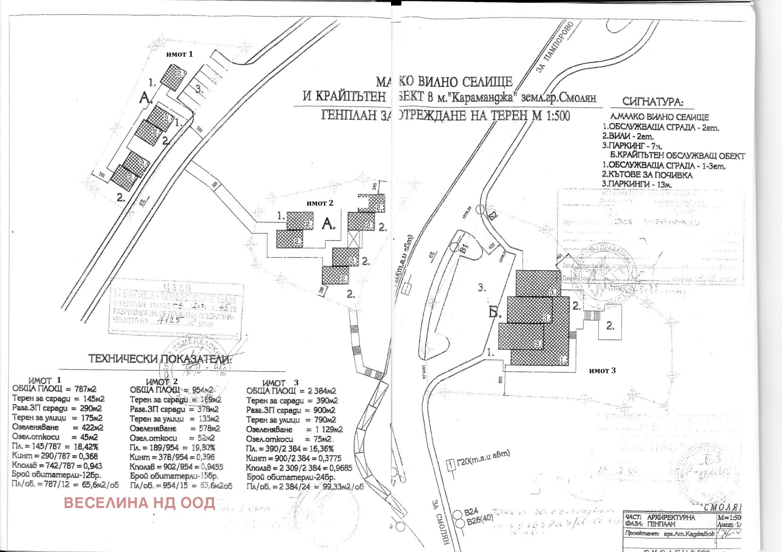 Продаат се три имота с обща площ 4125 кв.м. намиращи се в м-ст Караманджа, кк Пампорово, непосредствено на входа на курорта от гр. Смолян. Разположени са срещуположно от двете страни на главния път. Налични стари положителни становища от ВиК, Енергорзпределение, протокол за промяна на предназначение на земята и много други документи. Отредено е за 'Малко вилно селище и крайпътен обект'. Има направен идеен проект с технически показатели за трите имота от архитектурно ателие за селището със печати на съответните служби.