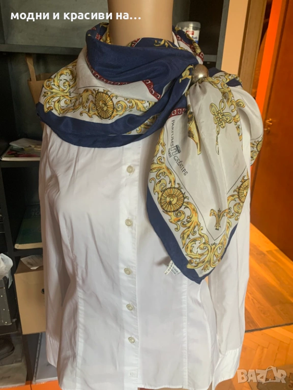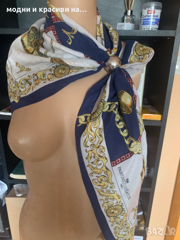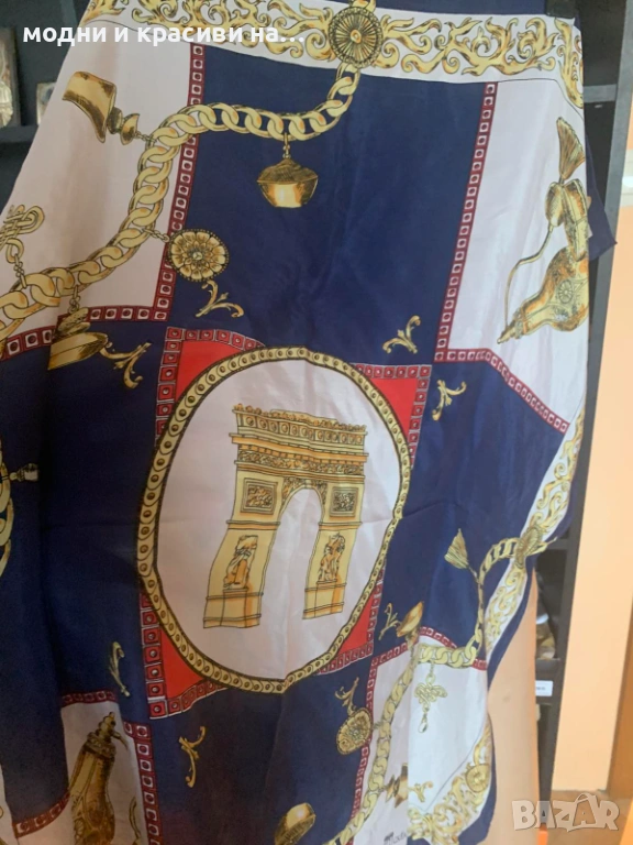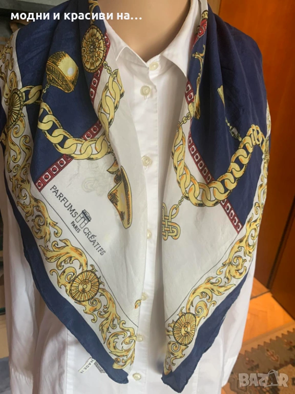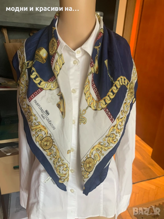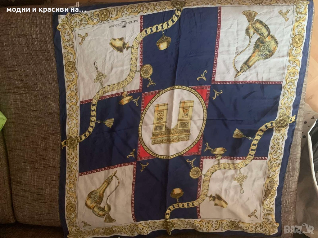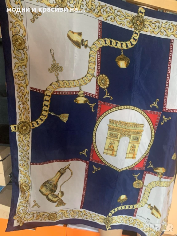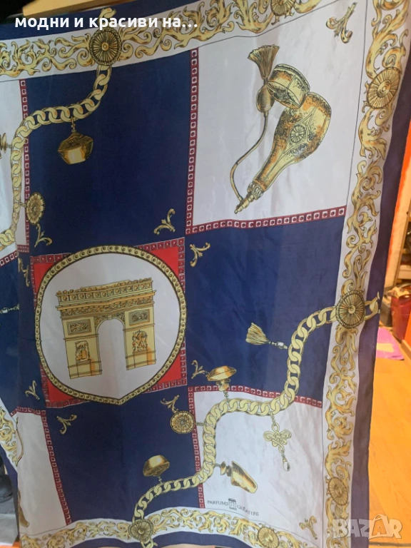 Разкошен копринен винтидж шал с тъмносини и златисти акценти. Оригинален десен с ретро шишета за парфюм и Триумфалната арка в средата.Изключително ефектен и много шик.