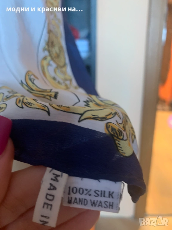 Шалът е изцяло изработен от коприна- гладка, лъскава, тежко падаща.