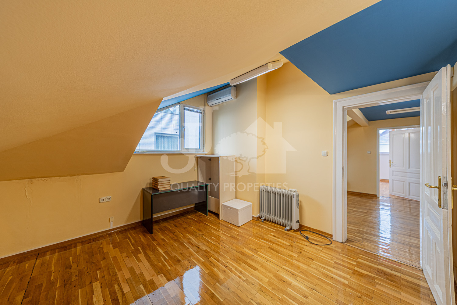 Имотът е след ремонт и е ситуиран на втори и трети етаж, предлага функционално разпределение, което осигурява комфорт и простор. Първото ниво с площ от 116 кв.м. включва входно антре, две светли и уютни спални, просторен двоен хол с балкон, отделна кухня с втори балкон и баня с тоалетна. Второ ниво с площ от 75 кв.м. разполага с три помещения със скосявания, баня с тоалетна и две самостоятелни входни врати, които позволяват допълнителна гъвкавост при използване на пространството.