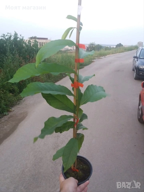 Asimina triloba, Асимина, Пау-пау, Индиански банан Размер около 10см за 12,50€ Размер 40-60см за 18€ Растенията ни са в саксии и това позволява да се засаждат цяла година или могат да се гледат така с месеци За поръчка пишете на лично Изпращаме чрез еконт Засаждане на шарена сянка зимоустоичиво за цяла България.Сравнително нова култура за България Не можете да го намерите в супермаркетите, даже и в родината си, поради факта че трябва да се консумира до четири – пет дни, след като е откъснат от дървото. Неповторимият му и несравним вкус на крем брюле с привкус на банан, ягода и манго взети заедно остава траен спомен в рецепторите ви. Силно лековитите му свойства са световно известни – именно за това е толкова ценен. Изисквания към климата и почвата: Асмината е дърво на умерените влажни зони и изисква „топло или горещо лято, мека или студена зима“. То може да се отглежда успешно в зони с температура до -26°С. Почвата трябва да бъде леко кисела (рН 5.5-7), дълбока, плодородна и добре дренирана. Добрия дренаж е от съществено значение за успеха. Асмината няма да вирее добре в тежка и преовлажнена почва. Отглеждано на слънце, дървото развива тясна пирамидална форма, с гъсти, увиснали листа. В сянката е с по-отворен хабитус на разклоняването. Грижа за младите дръвчета: При засаждане на дървета, оставете растояние 2.5 м между тях. Напоява се веднага след засаждането, нуждата от вода е през целия сезон. Шокът може да се предотврати след като се осигури временна сянка. Прилага се балансирано торене (20N-20P-20K) през 3 седмици по време на първото полугодие Растенията са в контейнери, което позволява засаждането им да се извършва почти целогодишно. Много от растенията променят вида си през периодите на своята вегетация, но тук в сайта със снимки се представят в най-атрактивния им вид. Повечето снимки в сайта ни покзват как ще изглеждат растенията след определен период и положени необходимите грижи. Моля разгледайте и другите ни растения в сайта. Благодарим че избрахте нас 😊 Тел. 0877977519