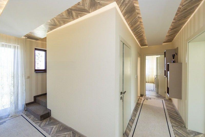 Разпределение: 1во ниво - , входно антре, просторен хол с кухненски бокс и трапезария, две спални, баня с тоалетна; 2ро ниво: една спалня с холна част и гардеробна, баня с тоалетна