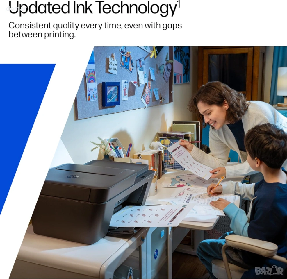 Многофункционален принтер, проектиран за лесна домашна употреба, предлагащ безжичен печат, сканиране и копиране с двубандов Wi-Fi, който автоматично се свързва отново за стабилна и безпроблемна връзка. Поддържа дистанционен печат чрез интуитивно мобилно приложение и предоставя достъп до широка гама от образователни работни листове чрез онлайн платформа за печат, което го прави подходящ за домашно обучение и организация. Създаден с мисъл за устойчивост, той съдържа висок процент рециклирана пластмаса, което допринася за намаляване на отпадъците. Устройството разполага с динамична технология за сигурност, която работи с касети, използващи оторизирани чипове или схеми, включително повторно използвани и рециклирани опции, и е съвместимо със специфични оригинални черни и трицветни мастилени касети, проектирани за постоянна производителност.