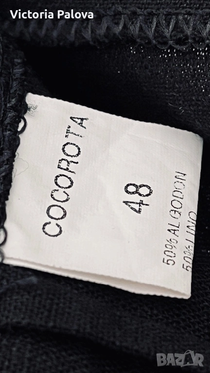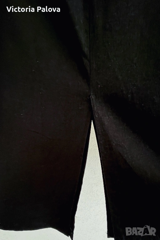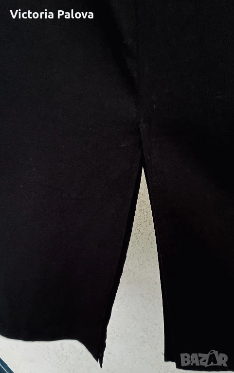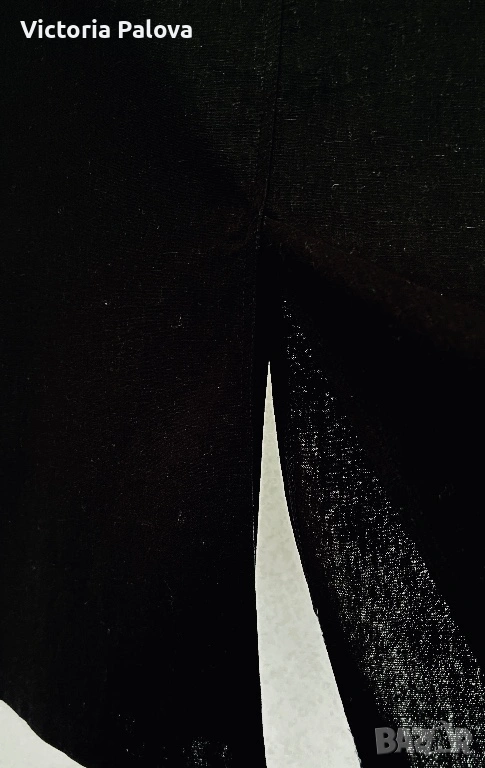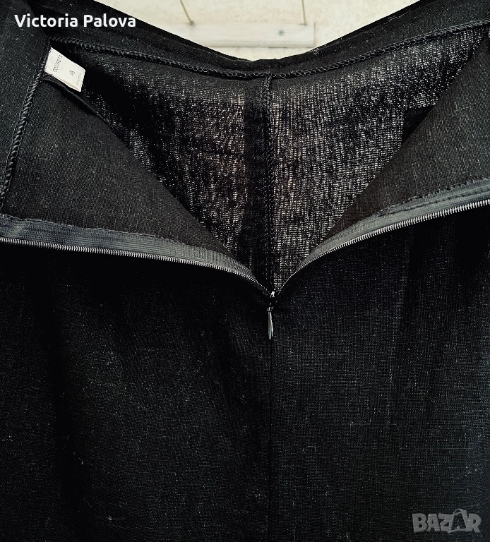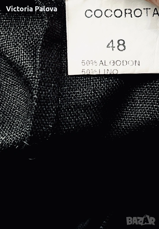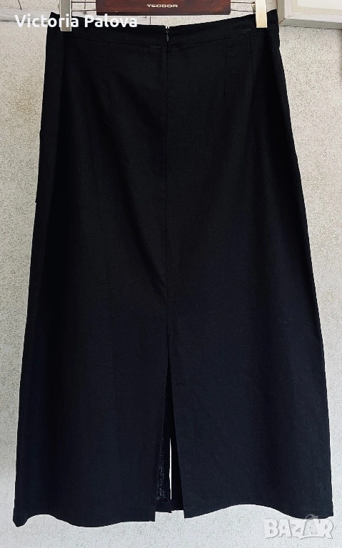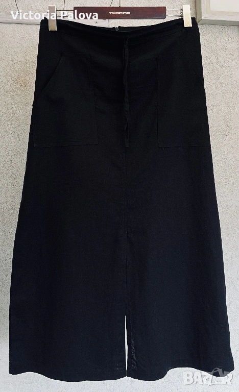 Елегантна черна пола от испанския бранд COCOROTA, произведена в Испания, идеална за лятото и преходните сезони, изработена от висококачествена материя с 50% памук и 50% лен, което я прави дишаща и удобна за носене. Стилът е модерен и универсален, с шлиц отпред и отзад по 32 см всеки, който добавя свобода на движение и женствен акцент, а талията от 96 см се регулира с връв за перфектно прилягане, дължината е 85,5 см, а ханшът едностранно е 56 см, което дава обща обиколка около 112 см. Тази пола в размер 48 пасва на различни фигури благодарение на връвта, с която може да се регулира размера на талията. Без дефекти, подходяща за ежедневни визии, офис или вечерни излизания – уникална находка от Барселона.
