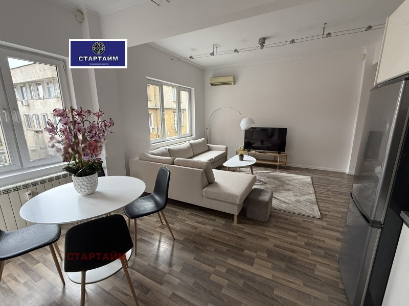Bright One-Bedroom Apartment for Rent in Central Sofia A very bright and welcoming one-bedroom apartment available for rent, located in a quiet inner building at 29A Tsar Osvoboditel Blvd, one of the most prestigious and central areas of Sofia. The property is within walking distance of Orlov Most metro station, Sofia University, BNT, Doctor s Garden and park Borisova Gradina. The apartment is situated on the 4th residential floor (no elevator) and consists of an entrance hall, a bedroom with a double bed and a large four-door wardrobe, a spacious living room with dining area and fully equipped kitchen, as well as a separate bathroom and toilet. The kitchen is fully fitted with built-in oven, dishwasher, washing machine and refrigerator. The living room is air-conditioned. Heating is provided by central district heating (TEC). The apartment is offered for long-term rent only, with a minimum lease period of two years.