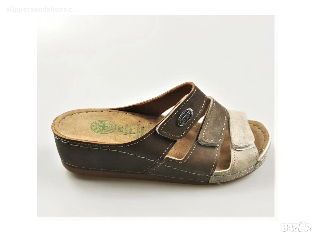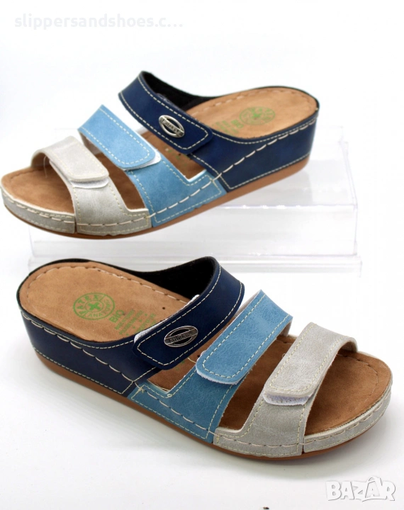 Ефектен дизайн: Комбинацията от три цвята прави чехлите изключително лесни за съчетаване с дънки, панталони или ежедневни рокли.
