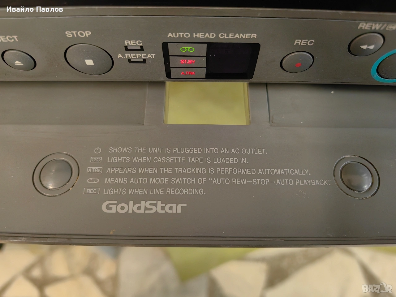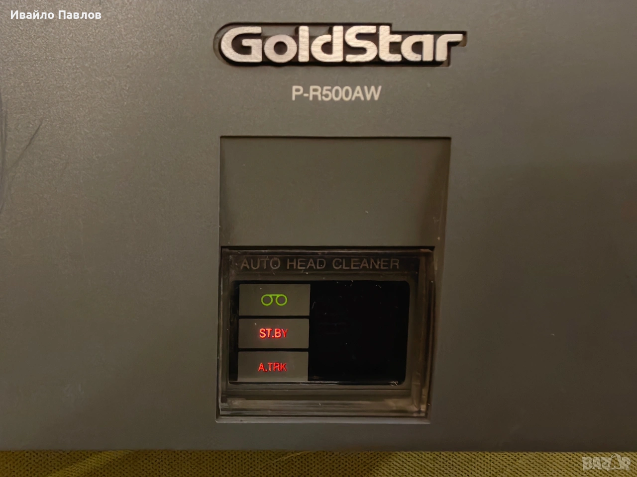 Модел Видео GoldStar P - R500AW Технически изправно, превърта в двете посоки, пуска и спира, вкарва и изважда касетка, дисплей работи, както и всички бутони. Отвътре е чисто, механика без забележки. Хубава картина и звук, работещ tacking. Идва в комплект със ав кабел и вграден захранващ кабел. Подарък 1 брой видеокасетка с филм За страната с Еконт/Спиди