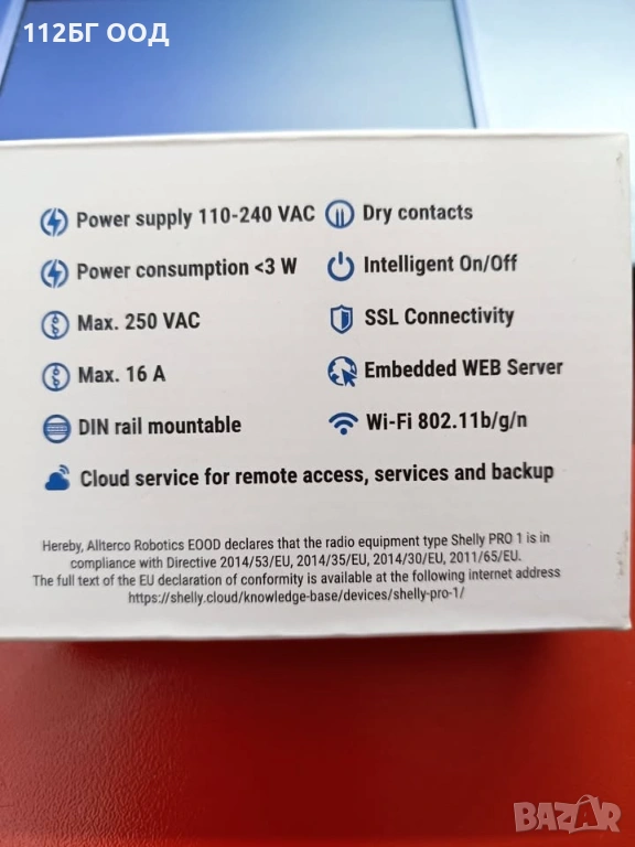 Wi-Fi Smart, импулсното реле Shelly PRO 1, 268001, e едноканално и предназначено за монтиране на DIN шина, позволяващо да се контролират електровериги от разстояние с отдалечен достъп (през интернет) или през облачна услуга чрез Wi-Fi, от телефон, компютър или друго устройство поддържащо HTTP и/или UDP. Може да управлява до един електрически кръг, самостоятелно или да се използва като аксесоар за смарт управление на дома. Може да се ползва както за 110~240 VAC с максимален товар 16A така и 0~30 VDC с товар 12A. Използва радио протокол Wi-Fi 802.11 b/g/n с честота 2400-2500 MHz. Има възможност и за свързаност по кабел чрез LAN Ethernet RJ45.