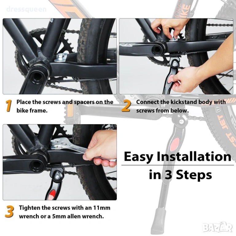 Закрепва се здраво за средната част на велосипеда с 11 мм гаечен или 5 мм шестограмен ключ – бързо и безпроблемно.