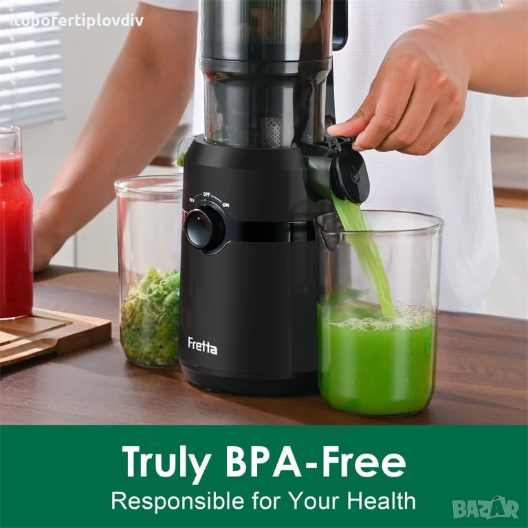Материал Tritan без BPA: Бавнооборотната сокоизстисквачка Fretta, изработена от хранителни материали Tritan без BPA, предлага спокойствие с всяка глътка. За потребителите, които са загрижени за здравето си, изборът на сокоизстисквачка, изработена от материал Tritan без BPA, може да осигури спокойствие, знаейки, че сокът им не влиза в контакт с потенциални рискове за здравето. PCTG материал, предлагащ по-висока здравина и издръжливост.