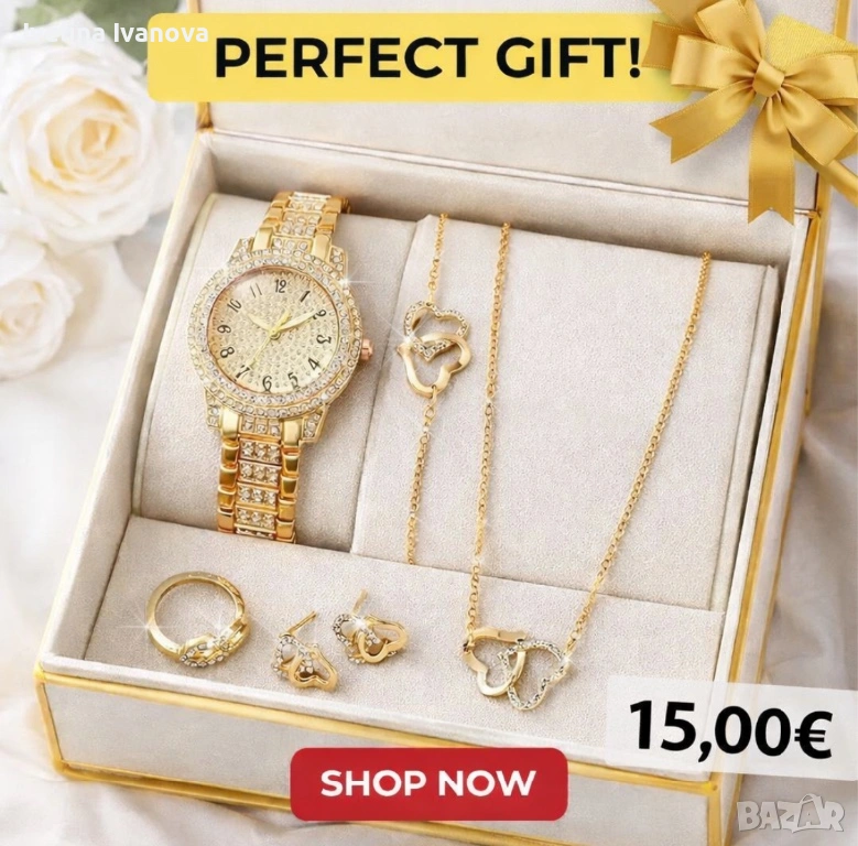 💎 Пълен комплект – часовник, колие, гривна, обеци и пръстен