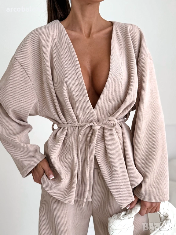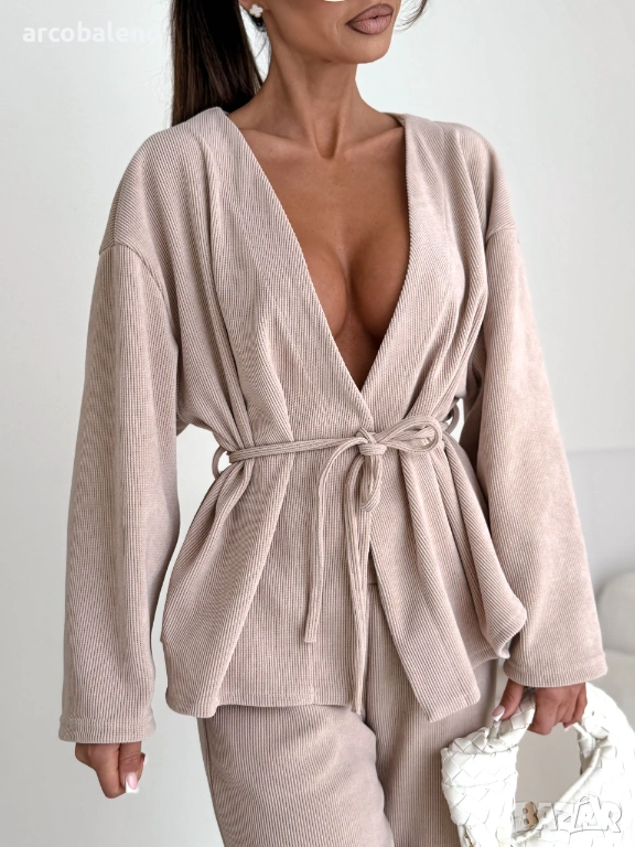 Този елегантен комплект от кадифени дрехи в класически бежов нюанс е перфектната комбинация от комфорт и женствен стил. Свободният топ с деколте и колан красиво подчертава талията, а широките панталони придават на силуета лек и модерен вид. Идеален за ежедневно носене, както на работа, така и в движение.