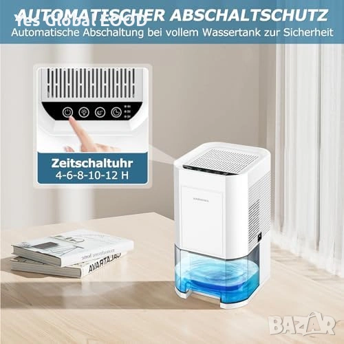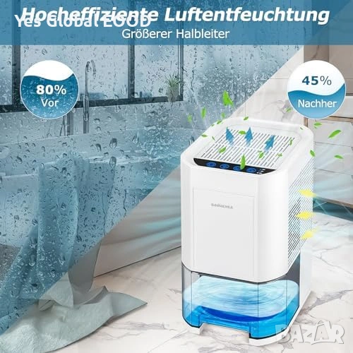 Компактен електрически влагоуловител с резервоар 1200 ml, подходящ за дома, баня, мазе или малки помещения. Ефективно намалява влагата, предотвратява мухъл и неприятни миризми.