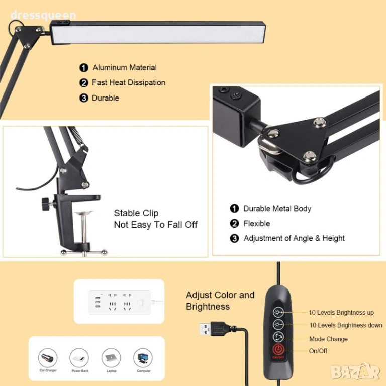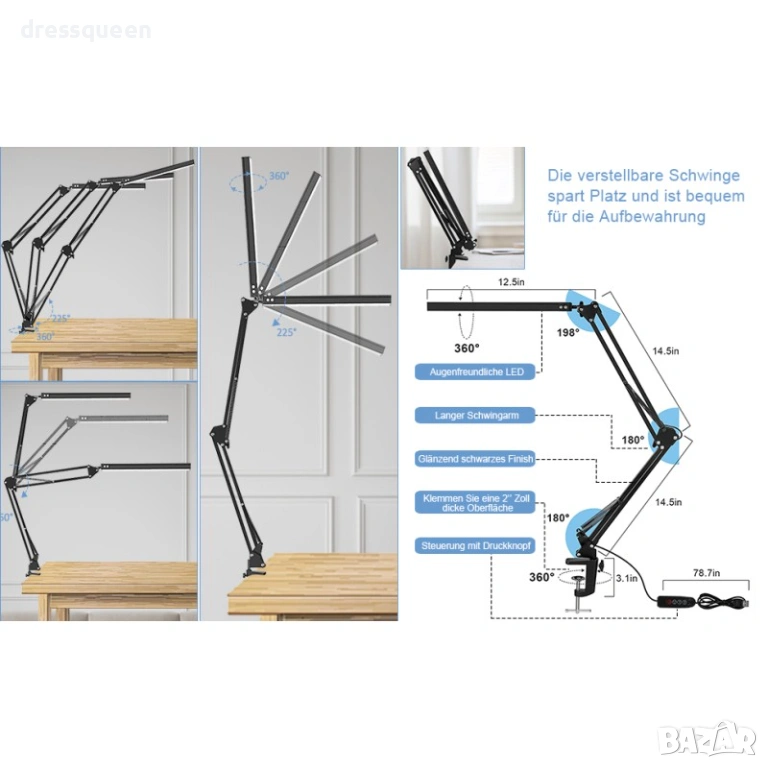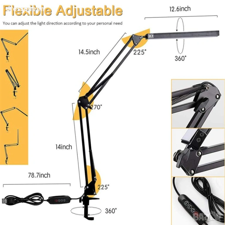 ✅ Гъвкав и стабилен дизайн – Регулируемо метално рамо и 360° въртяща се глава осигуряват оптимален ъгъл на осветление.