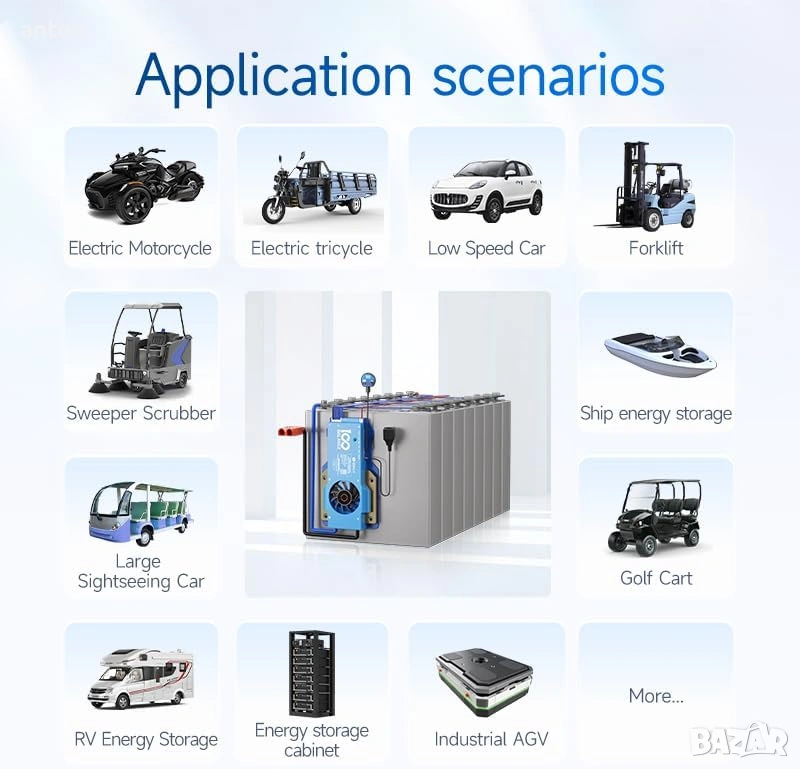 Универсална съвместимост: Поддържа широка гама от типове батерии, включително Lifepo4, литиево-йонни и LTO с различни конфигурации на клетките.