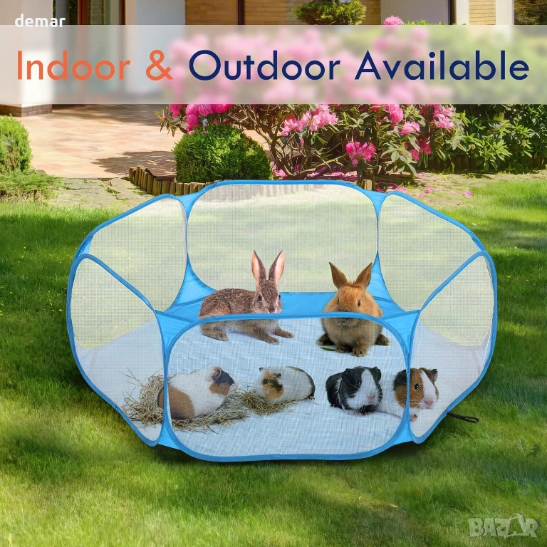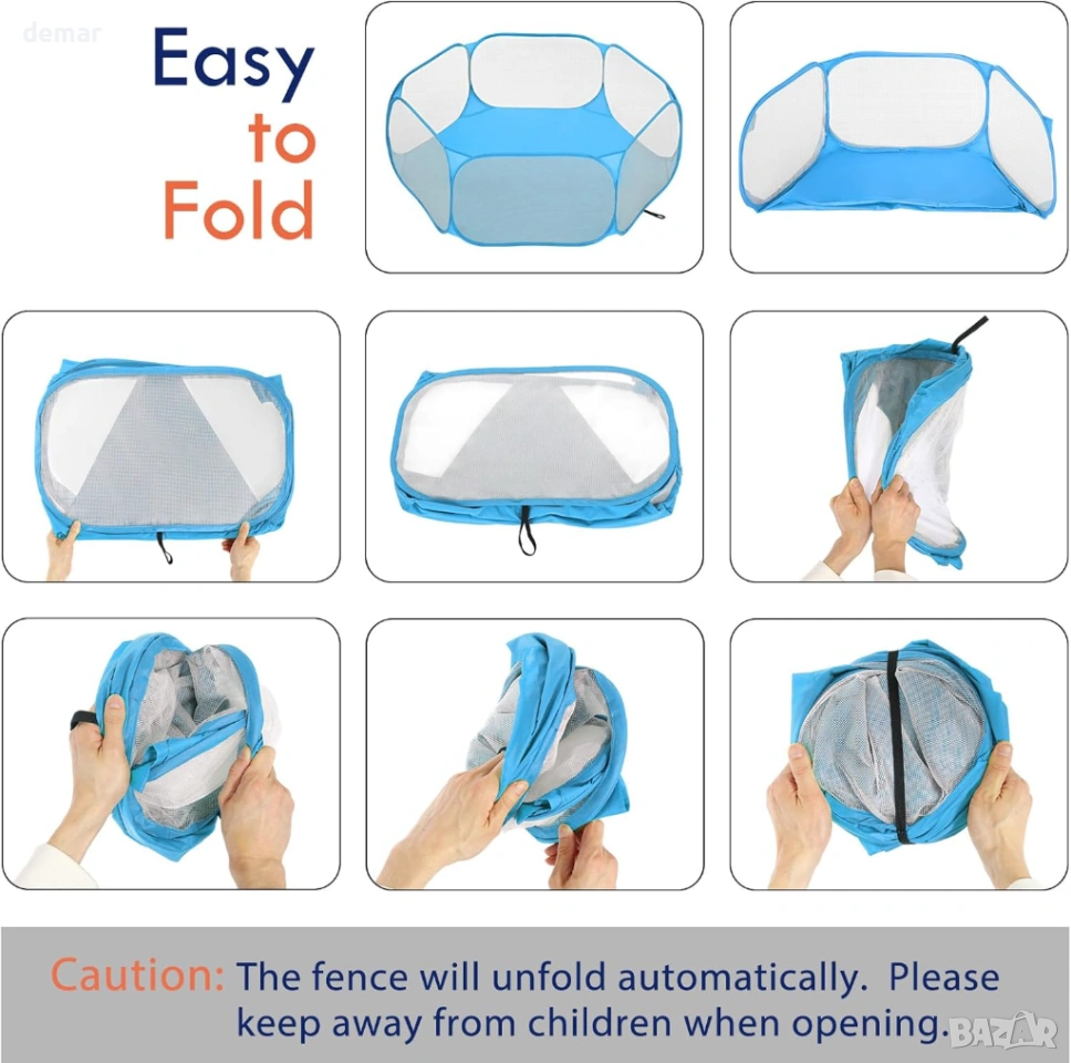 Водоустойчивата основа от полиестерна тафта 190T предотвратява проникването на урина по пода, а отвореният дизайн позволява лесно почистване и удобен достъп. Подобрената мрежа с висока плътност и подсилената материя подобряват издръжливостта и помагат за предотвратяване на преглъщане и бягство от малки животни. Вградената сгъваема рамка се разгъва автоматично за секунди, елиминирайки сложното сглобяване. Лека и сгъваема за лесно транспортиране и съхранение, но просторна в отворено състояние, тя удобно побира множество пиленца, патета, пъдпъдъци и други малки животни. Подходяща за широк спектър от малки домашни любимци, включително домашни птици, котенца, таралежи, хамстери, морски свинчета, порове, зайци, влечуги и други, осигурявайки сигурна и практична зона за мътене или игра.