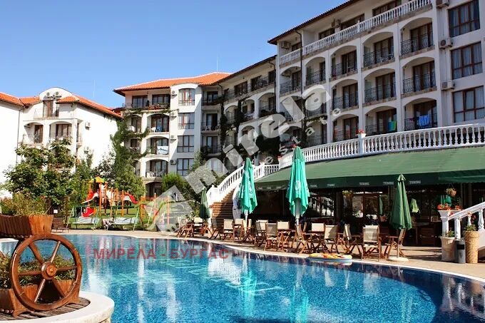460878 Двустаен апартамент, разположен в живописния курортен град Свети Влас, комплекс 'Триумф Холидей Вилидж' предлага перфектната комбинация от спокойствие, модерна инфраструктура и атмосфера на уют. Комплексът се състои от няколко елегантни сгради, заобиколени от добре поддържани зелени алеи и просторни зони за отдих. На територията е осигурено всичко за безгрижна почивка: открит басейн, ресторант с разнообразно меню, фитнес зала, детски площадки, както и денонощна охрана, рецепция и паркинг.