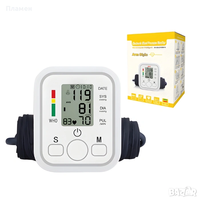 Автоматично измерване с маншет за горната част на ръката – удобно и прецизно отчитане само с натискане на бутон.